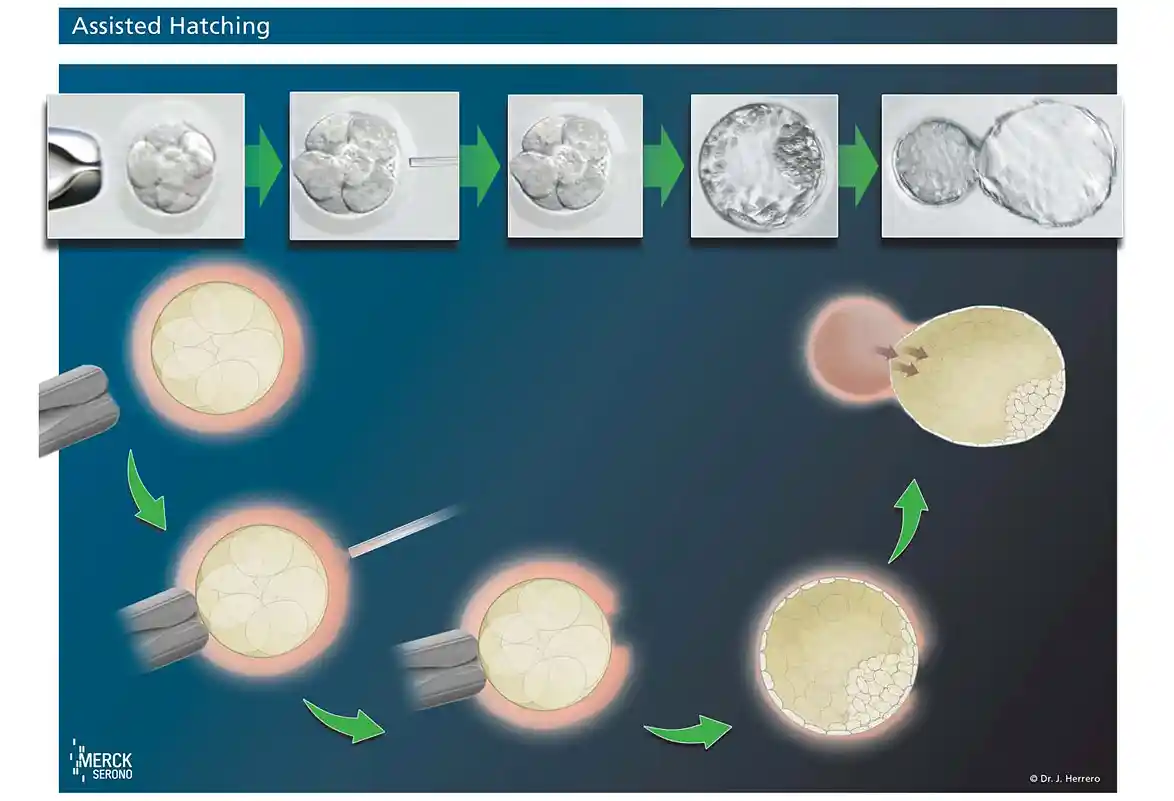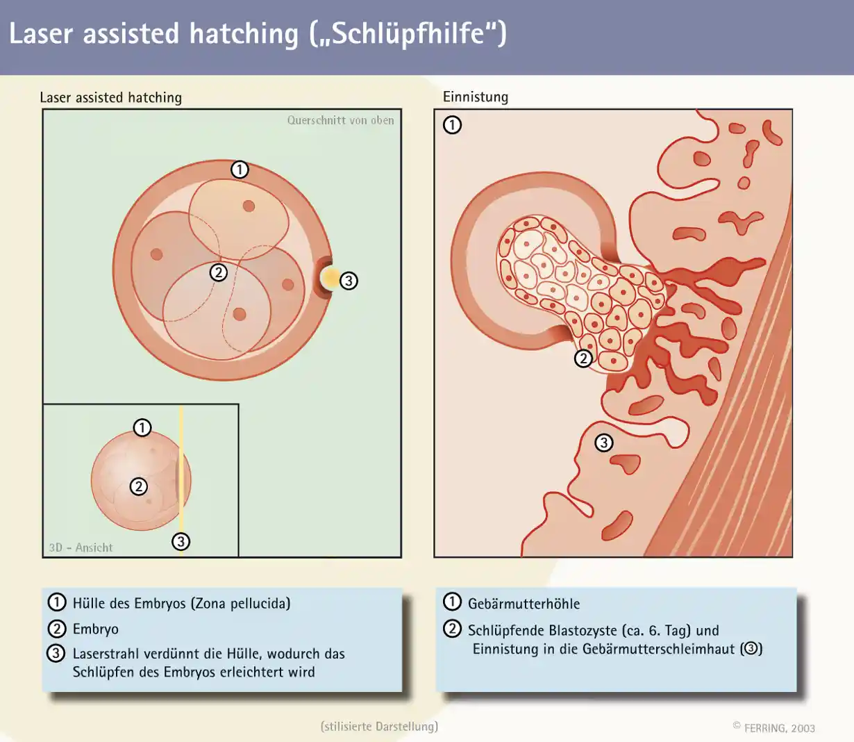 Assisted Hatching ist eine Methode wodurch die Schwangerschaftsrate erhöht werden kann. Damit der Einnistung in der Gebärmutterschleimhaut geholfen wird, sollte die schützende Hülle (Zona pellucida) des Embryos an einer Stelle ausgedünnt werden, damit der Embryo es leichter hat herauszuschlüpfen. Das Assisted Hatching wird in erster Linie bei eingefrorenen Embryonen (Kryozyklus), Frauen über 37 Jahre alt, und nicht optimaler Entwickelung der Embryonen angewendet.